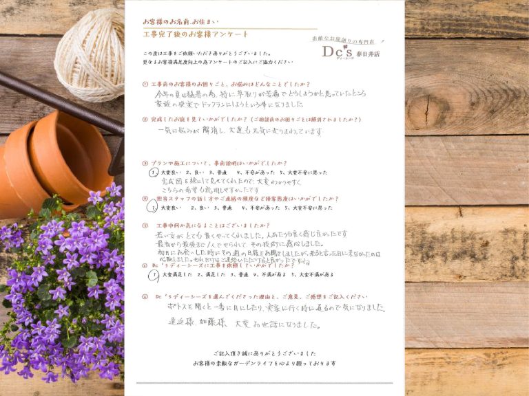デザインの素晴らしさと担当の方のお人柄の良さが決め手となりました。 工事中の状況説明など途中で入れていただけると安心ですし変更時に何をどのようにするのか材料ひとつ無知な私たちにとっては不安でしたので説明いただけると更に安心かと思いました。迅速丁寧な御対応、素敵なお庭をありがとうございました。