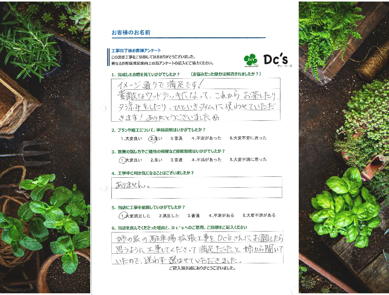 イメージ通りで満足です! すてきなウッドデッキになってこれからお茶したり夕涼みをしたり、ひといきタイムに使わせていただきます! ありがとうございました。