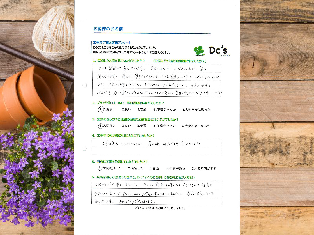 とてもステキで喜んでいます。子どもたちは人工芝の上で毎日遊んでいます。 草とりの負担が減りとても有難いです。 ガーデンルームができて洗たく物を干したり、そこでのんびり過ごせたりと嬉しいです。 今までその庭を使うことがほとんどなかったのですが、毎日行きたくなり使っています!