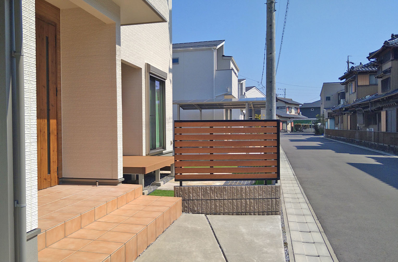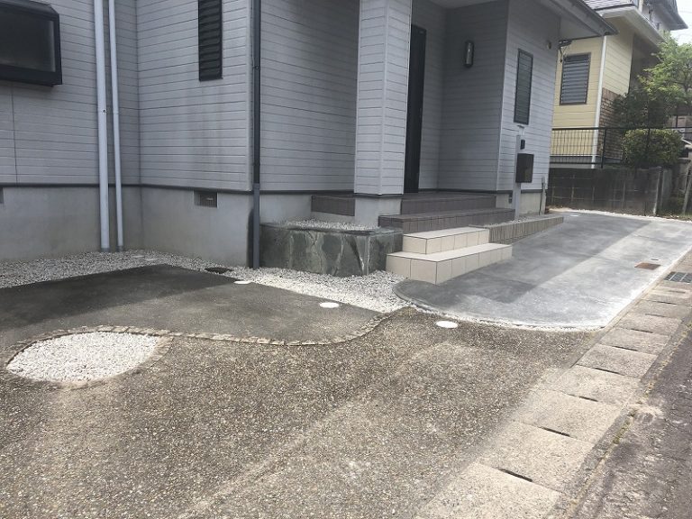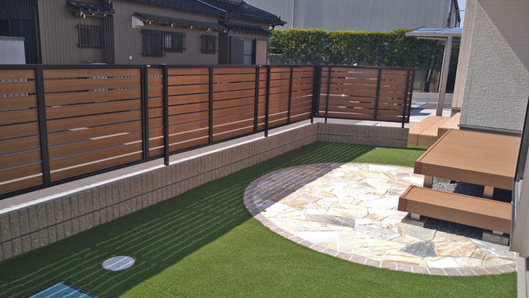 乱形と木目調がかわいい、ナチュラルデザインの外構 工事場所 岐阜県 関連カテゴリー リフォーム / 防草対策 / ガーデンルーム&デッキ / お庭 / カテゴリから選ぶ 新築 かっこいい おしゃれ 照明 植栽 防草対策 階段&アプローチ ガーデンルーム&デッキ お庭 駐車場 ファサード リフォーム かっこいい おしゃれ 照明 植栽 防草対策 階段&アプローチ ガーデンルーム&デッキ お庭 駐車場 ファサード おすすめ施工例 キーワードから選ぶ 門周り 受賞作 クローズ Designer Yoshimura LIXIL 目隠しフェンス オープン外構 三協アルミ フェンス セミクローズ外構 駐車場増設 立水栓 YKK 宅配ボックス